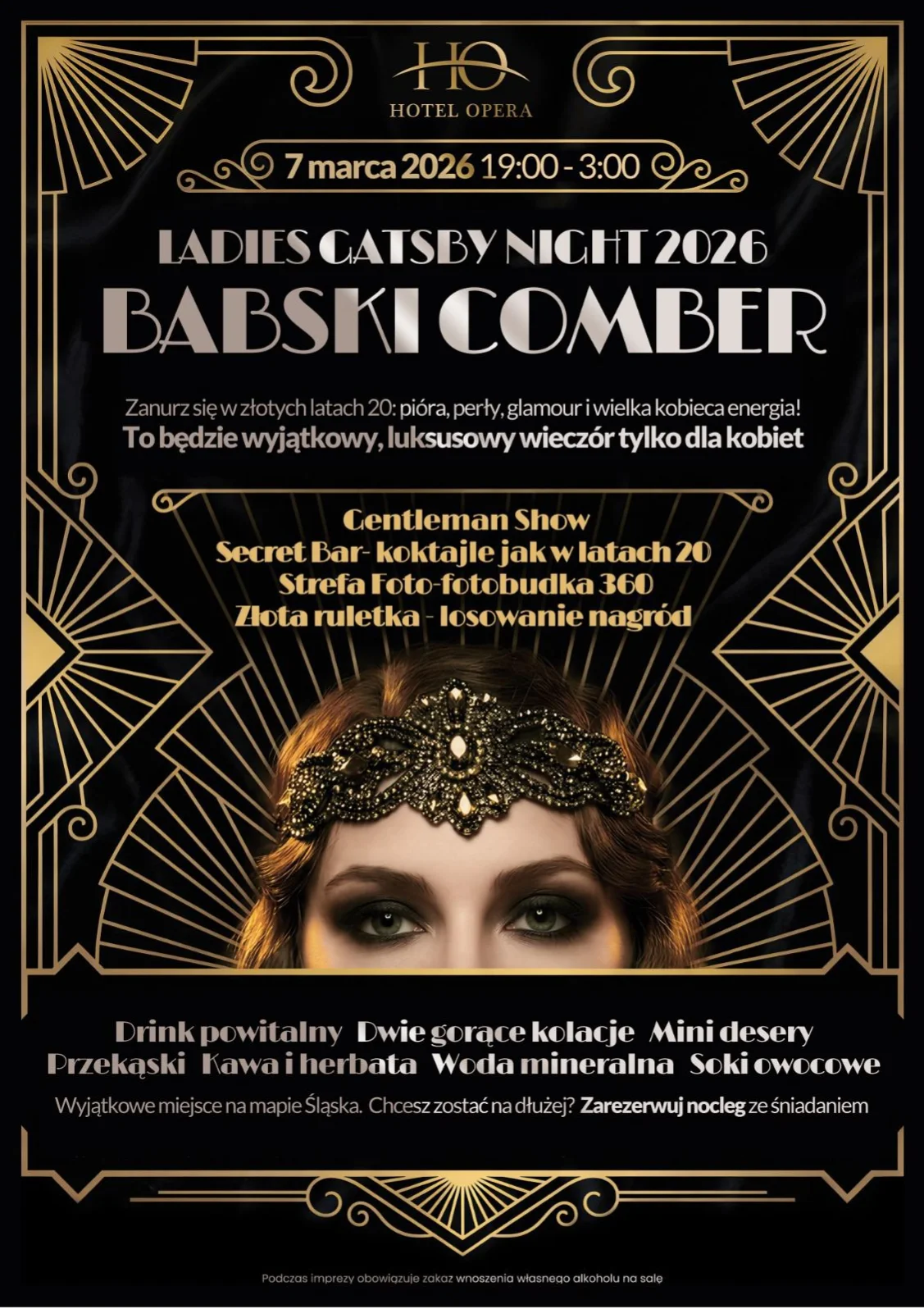 Przenieś się z Wycieczkowo.eu do świata lat 20., pełnego blasku, muzyki i kobiecej energii! 07.03 (sobota) zapraszamy na niezwykły „Luksusowy Wieczór – Babaski Comber” w eleganckim Hotelu Opera* w Tarnowskich Górach. Startujemy o 19:00, bawimy się aż do 03:00, a wszystko w klimacie wielkiego stylu i filmowego szyku.